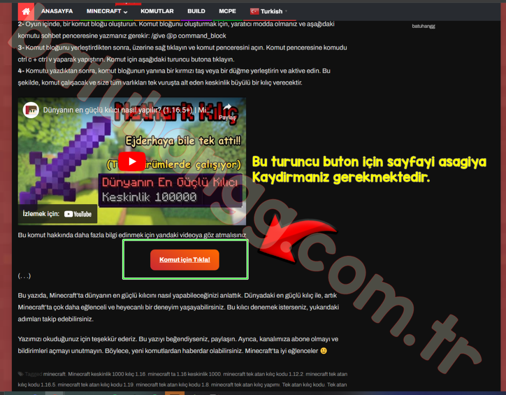 Mükemmel bir soru. Eğer bunu okuyorsanız yüksek ihtimal YouTube videomdan linke tıklayıp komudu bulamamışsınızdır. Komut tıkladığınız linkte aşağı kaydırıp gözünüzle taradığınız zaman kolaylıkla bulabileceğiniz boyutta turuncu bir buton olarak tüm yazılarımızda bulunuyor. Bazı istisnai durumlarda buton olarak değil, yazının içerisinde bulunacak şekilde yerleştirilmiş olabilir.